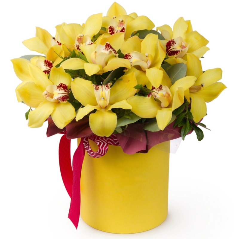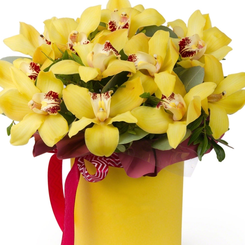 Букет состоит из 17 желтых орхидей, зелень, коробка, оазис, атласная лента.