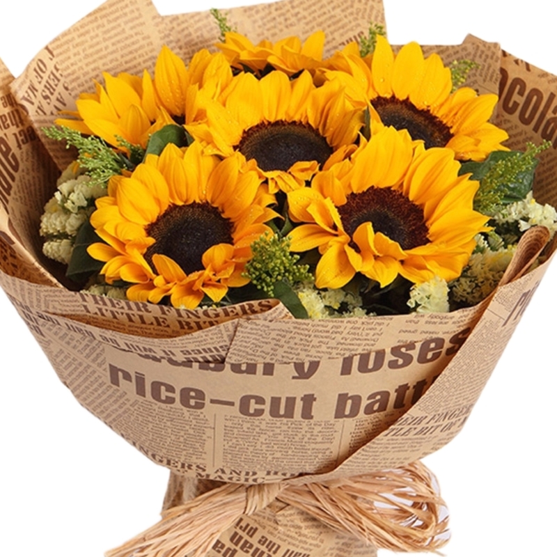 Букет состоит из 7 подсолнухов, зелень, крафт.