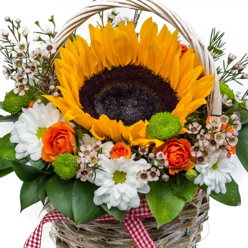 Букет состоит из 1 подсолнух, 3 ветки ваксфлауэра, 3 кустовые розы, 4 ветки кустовых хризантем, зелень, корзина, оазис.