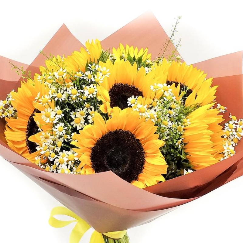 Букет состоит из 7 подсолнухов, 10 танацетум, зелень, крафт, атласная лента.