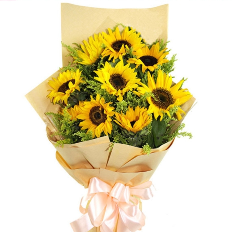 Букет состоит из 9 подсолнухов, 10 веток солидаго, зелень, крафт, атласная лента.