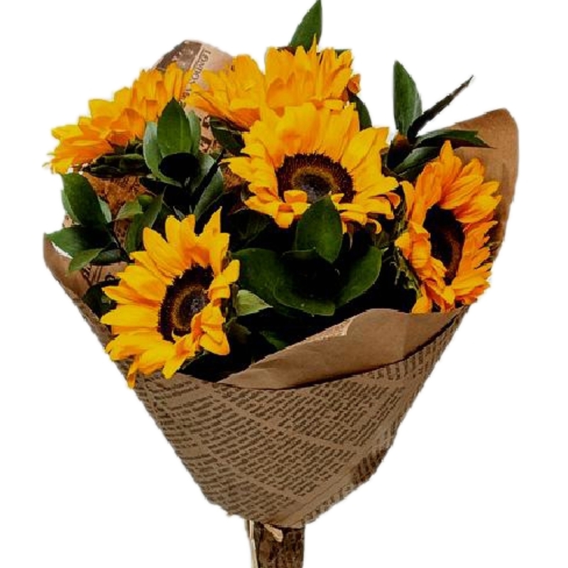 Букет состоит из 5 подсолнухов, зелень, крафт, атласная лента.