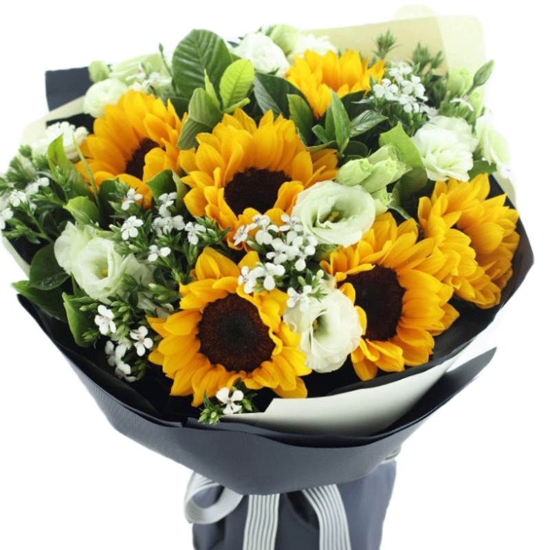 Букет состоит из 7 подсолнухов, 6 веток эустомы, декоративная зелень, красивая упаковка, атласная лента.