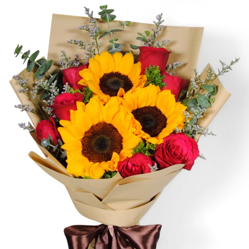 Букет состоит из 10 красных роз, 3 подсолнуха, декоративная зелень, крафт, атласная лента.