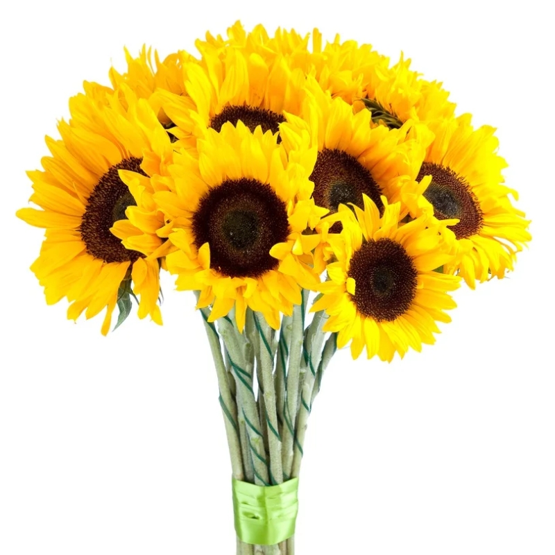 Букет состоит из 13 подсолнухов, прозрачная упаковка, атласная лента.