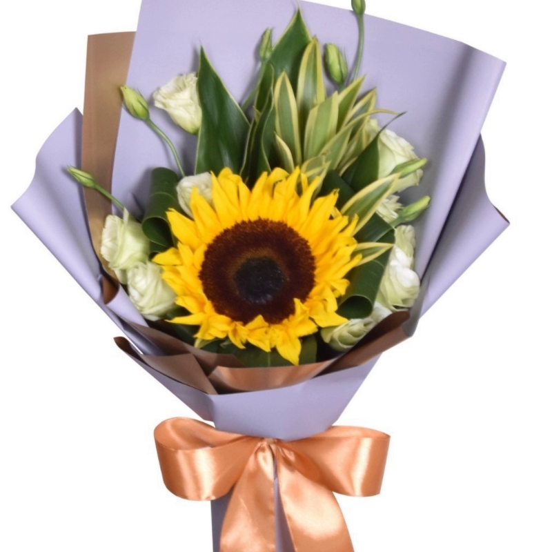 Букет состоит из 1 подсолнух, 4 ветки эустомы, зелень, красивая упаковка, атласная лента.