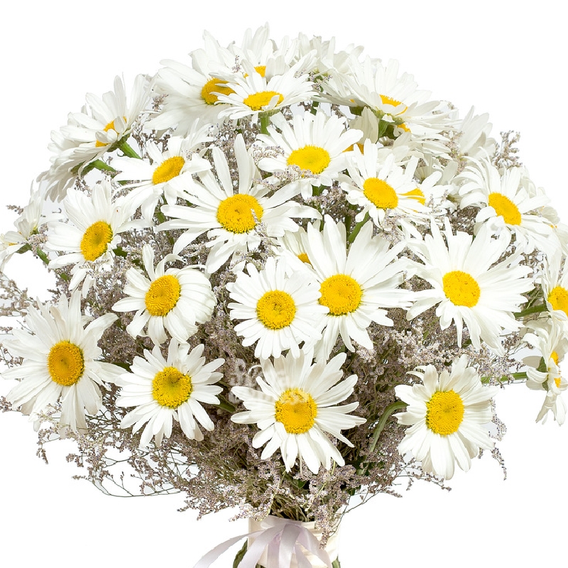 Букет состоит из 35 ромашек, 9 лимониум, прозрачная упаковка, атласная лента.