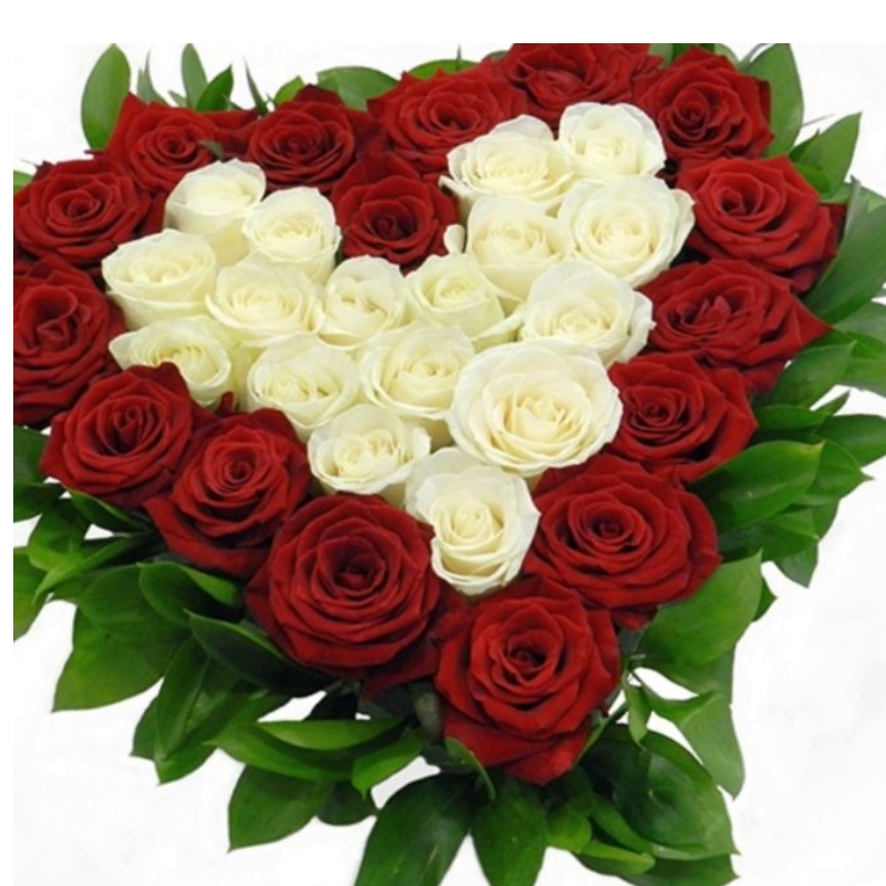Сердце из 33 красных и белых роз