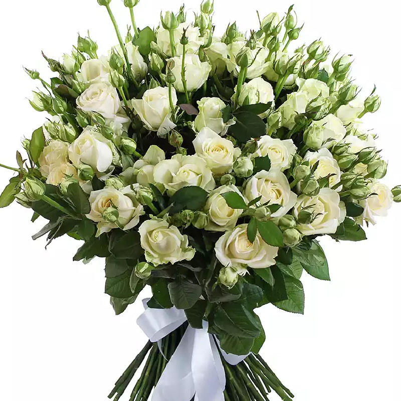 Букет состоит из 19 белых кустовых роз, прозрачная упаковка, атласная лента.