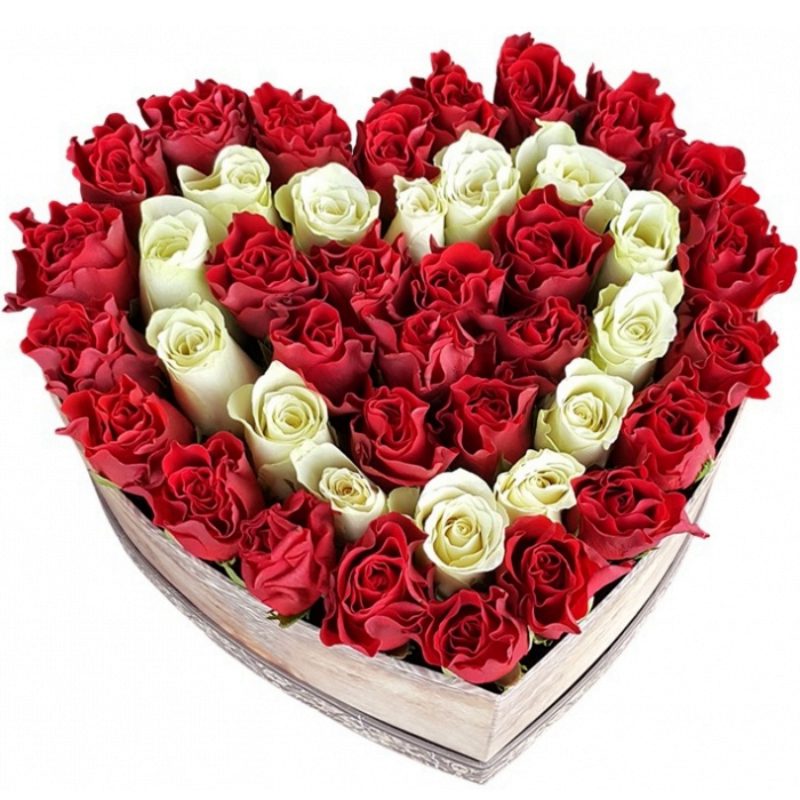 45 красных и белых роз, коробка в виде сердца.