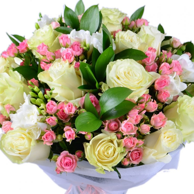 Букет состоит из 15 белых роз, 7 веток кустовых роз, 9 фрезий, зелень, красивая упаковка, атласная лента.