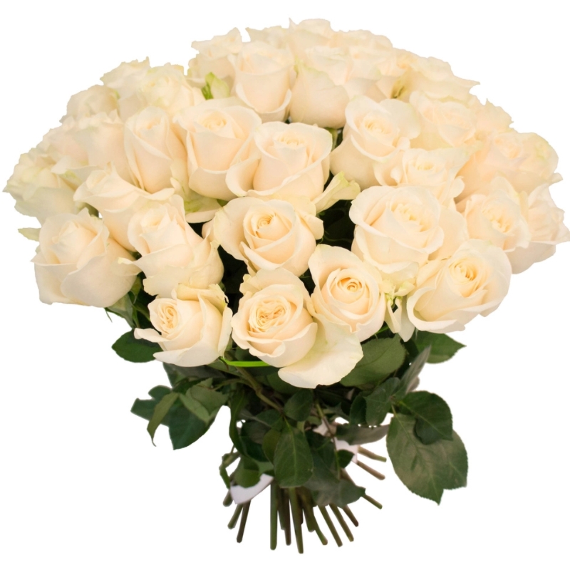 Букет состоит из 45 белых роз, прозрачная упаковка, атласная лента.