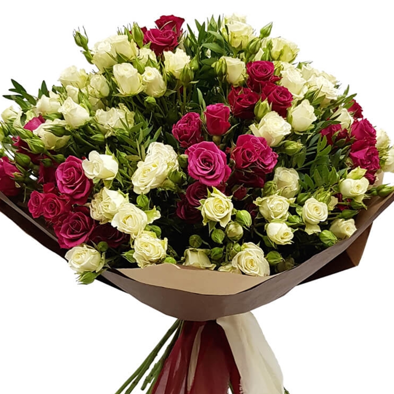 Букет состоит из 15 белых кустовых роз, 10 малиновых кустовых роз, крафт, атласная лента.