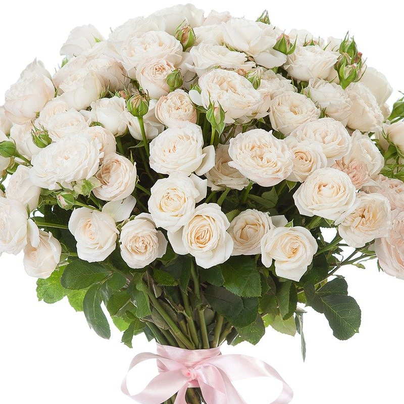 Букет состоит из 21 ветка белой кустовой розы, прозрачная упаковка, атласная лента.