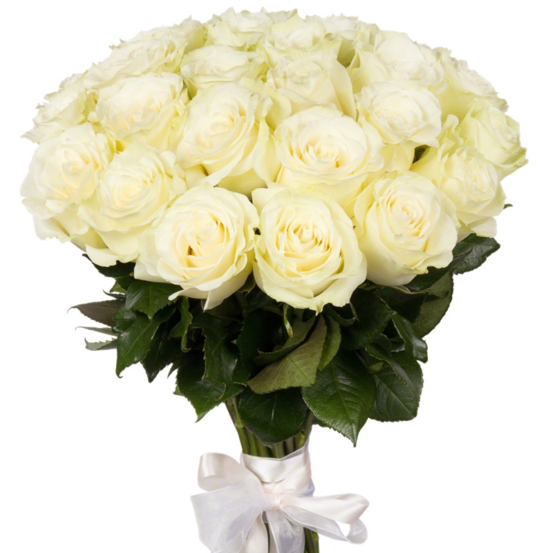 Букет состоит из 21 белая роза, прозрачная упаковка, атласная лента.