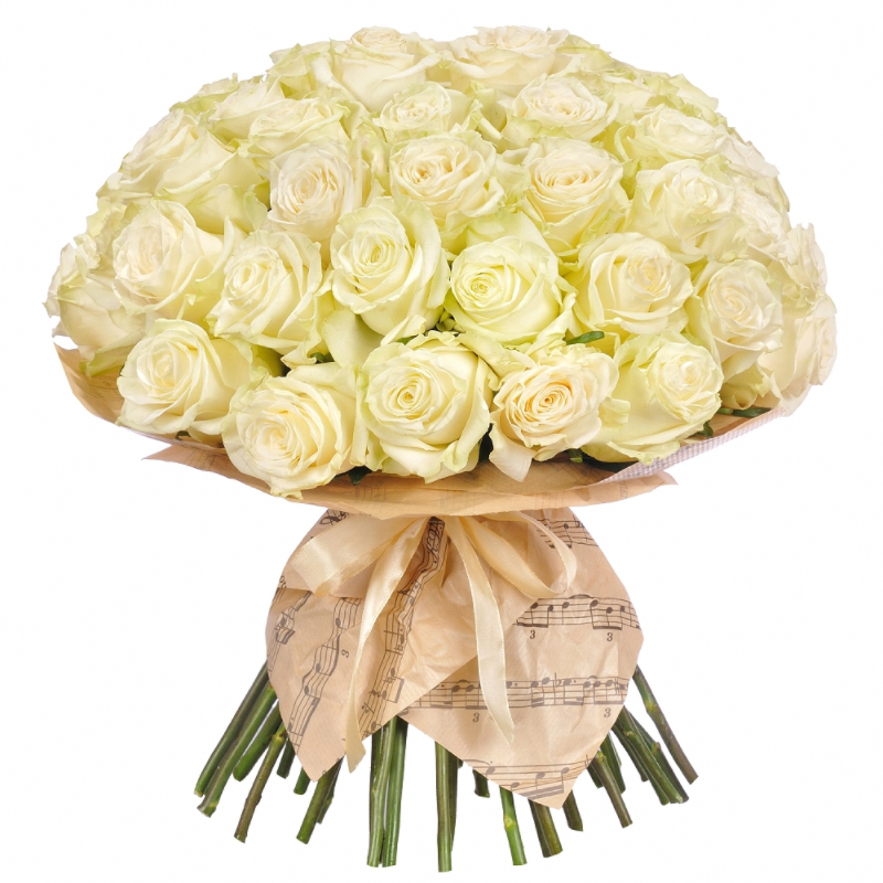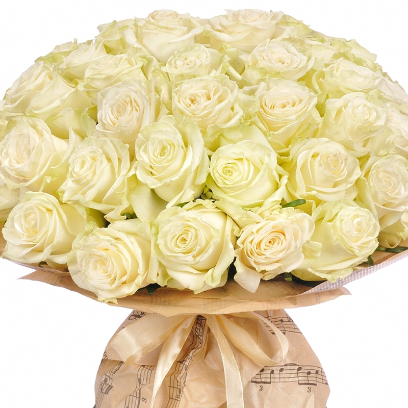 Букет состоит из 45 белых роз, крафт, атласная лента.