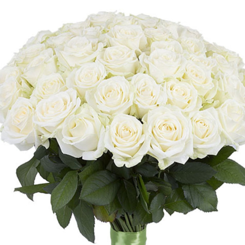 Букет состоит из 55 белых роз, прозрачная упаковка, атласная лента.