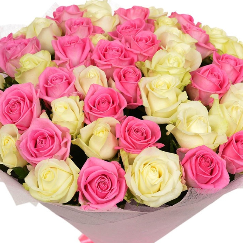 Букет состоит из 26 белых роз, 25 розовых роз, красивая упаковка, атласная лента.