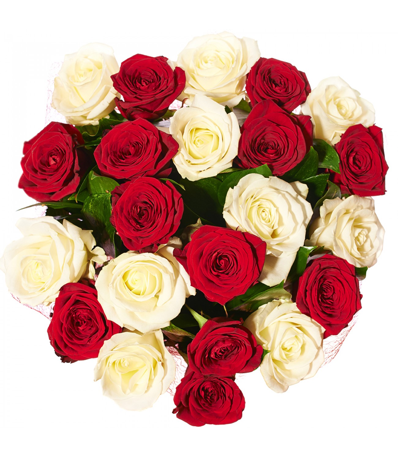 Букет состоит из 13 красных роз, 12 белых роз, зелень, красная упаковка, атласная лента.