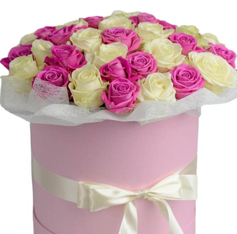 Букет состоит из 26 белых роз, 25 розовых роз, коробка, атласная лента.
