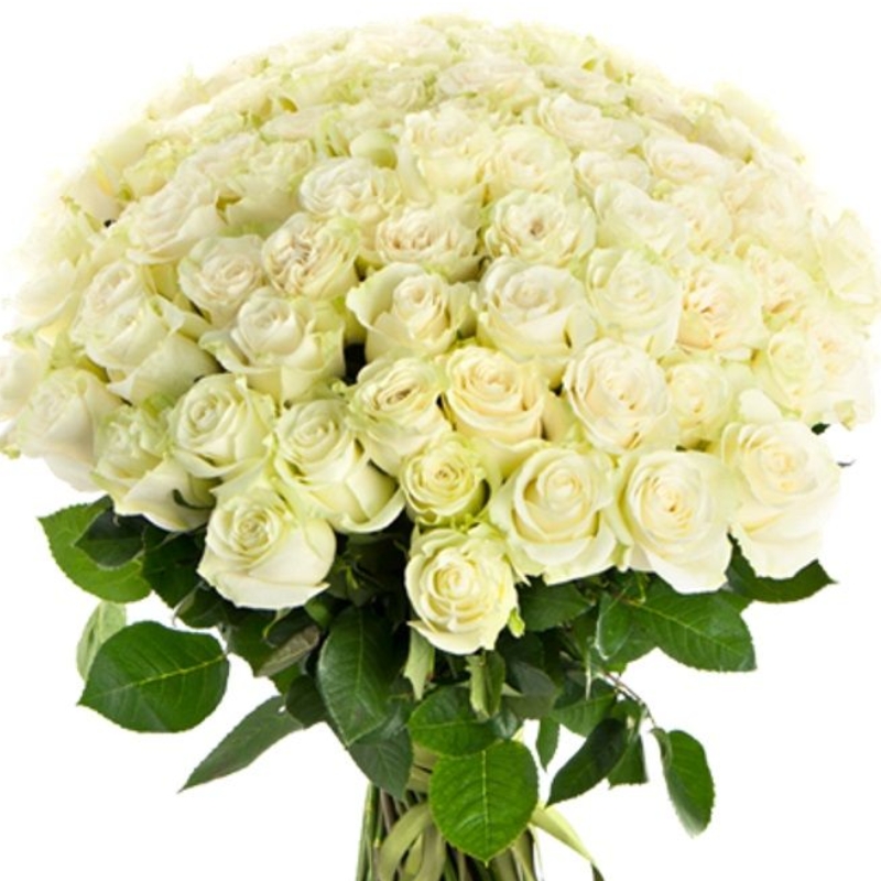 Букет состоит из 75 белых роз, прозрачная упаковка, белая лента.