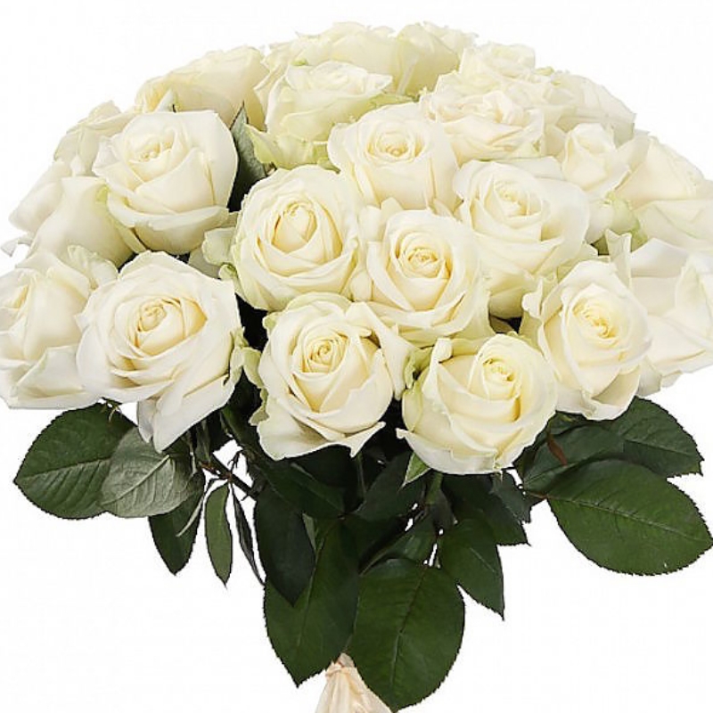 Букет состоит из 31 белая роза, прозрачная упаковка, атласная лента.
