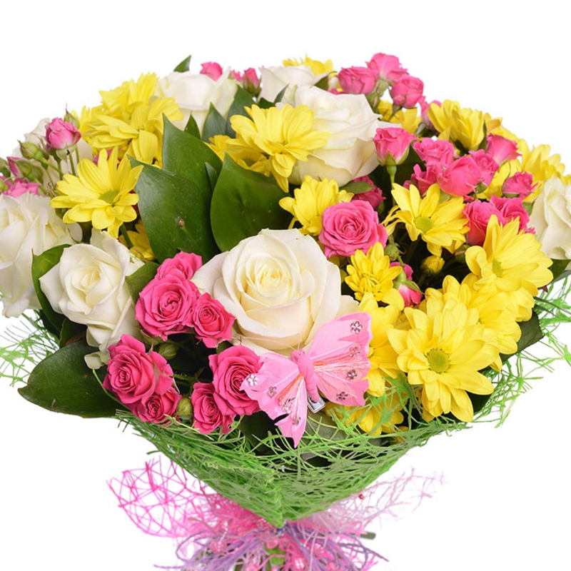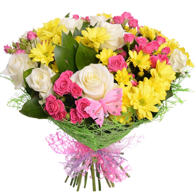 Букет состоит из 9 роз, 5 кустовых роз, 5 веток хризантем, рускус, красивая упаковка, атласная лента.