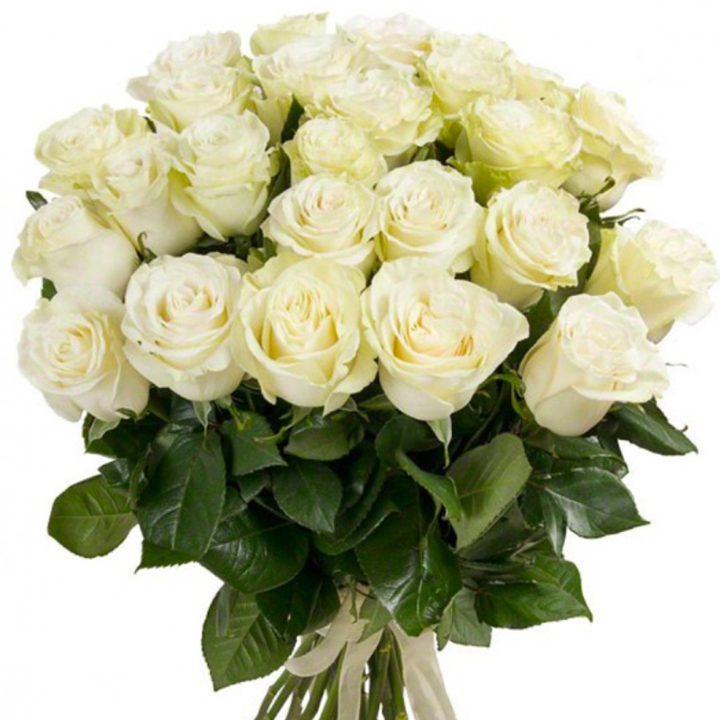Букет состоит из 25 белых роз, прозрачная упаковка, атласная лента.