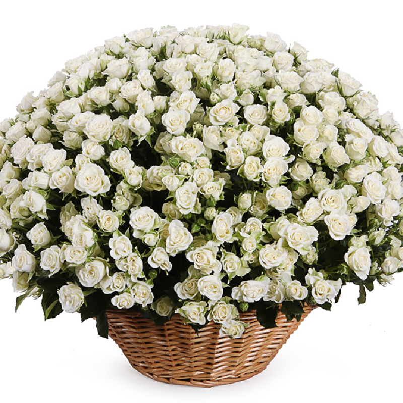 Букет состоит из 101 ветка белой кустовой розы, корзина, оазис.