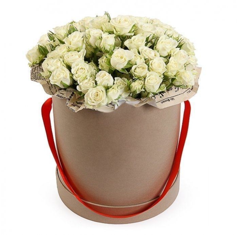 Букет состоит из 21 ветка белой кустовой розы, крафт, оазис, коробка.