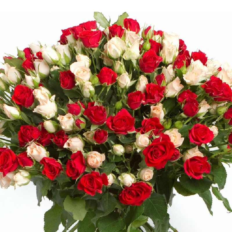 Букет состоит из MIX из 51 красной и белой розы, прозрачная упаковка, атласная лента.