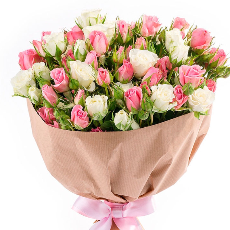 Букет состоит из 8 веток белых кустовых роз, 11 веток розовых кустовых роз, крафт, атласная лента.