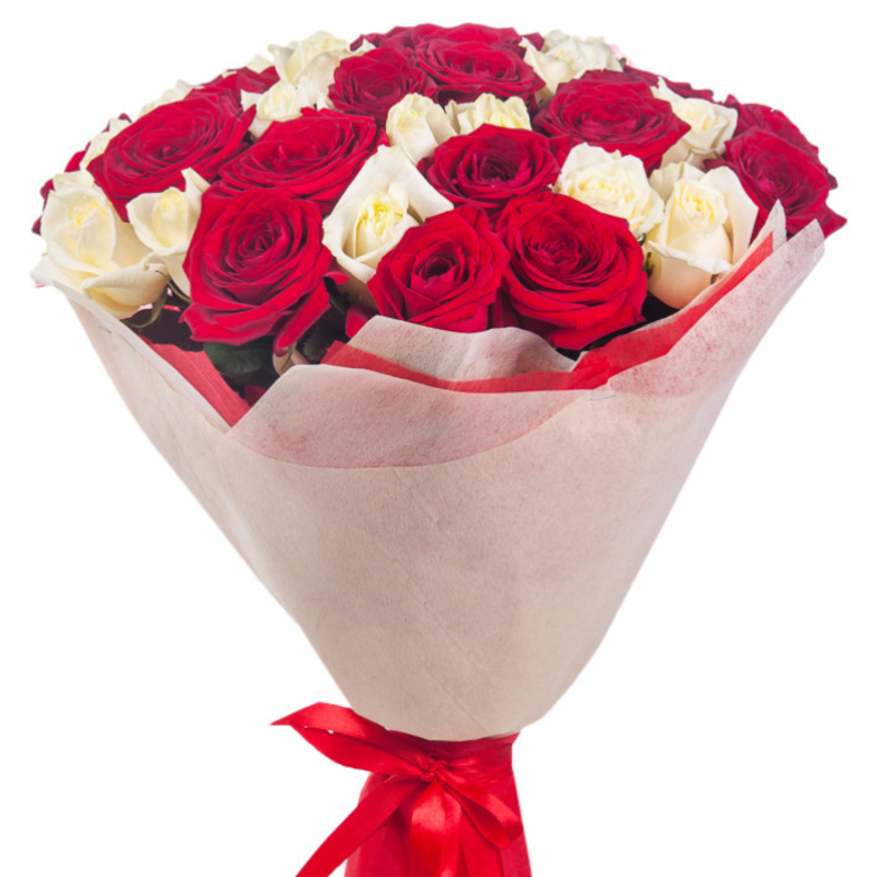 Букет состоит из 23 красные розы, 22 белые розы, красивая упаковка, атласная лента.
