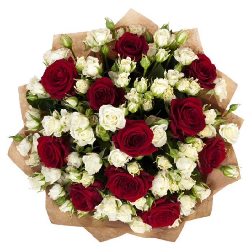 Букет состоит из 11 красных роз, 9 веток белой кустовой розы, крафт.