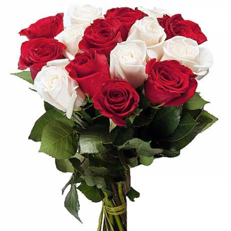 Букет состоит из 10 красных роз, 9 белых роз, прозрачная упаковка, атласная лента.