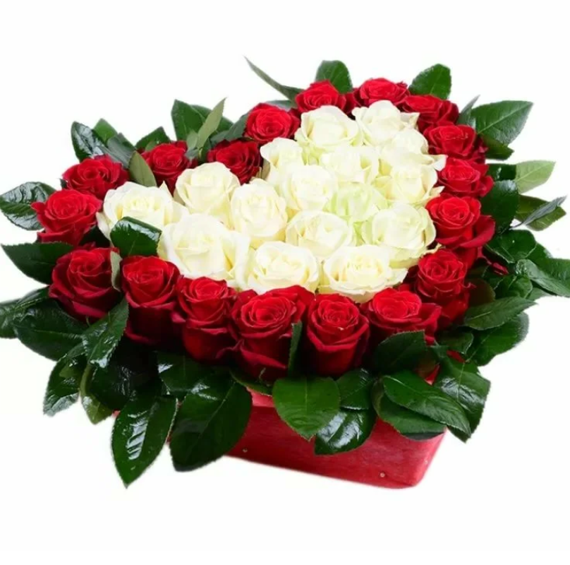 35 красных и белых роз, салал, коробка в виде сердца.