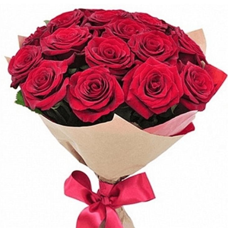 Букет состоит из 15 красных роз, крафт, атласная лента.