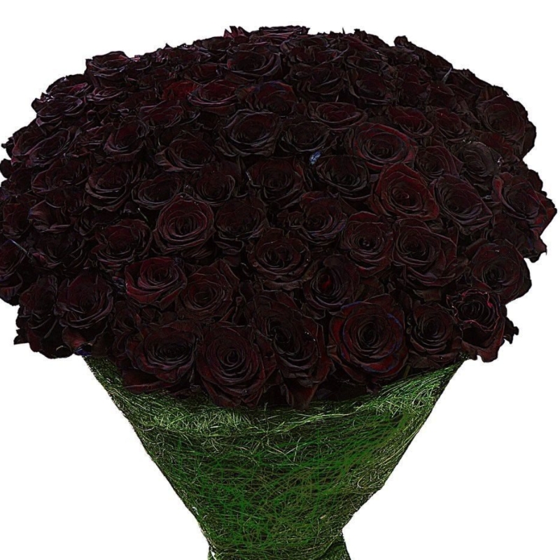Букет состоит из 101 темно - бордовая роза, сизаль, атласная лента.