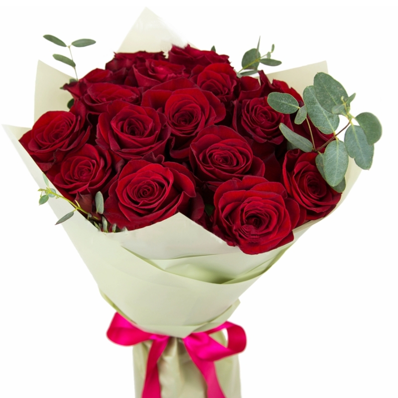 Букет состоит из 19 бордовых роз, эвкалипт, красивая упаковка, атласная лента.