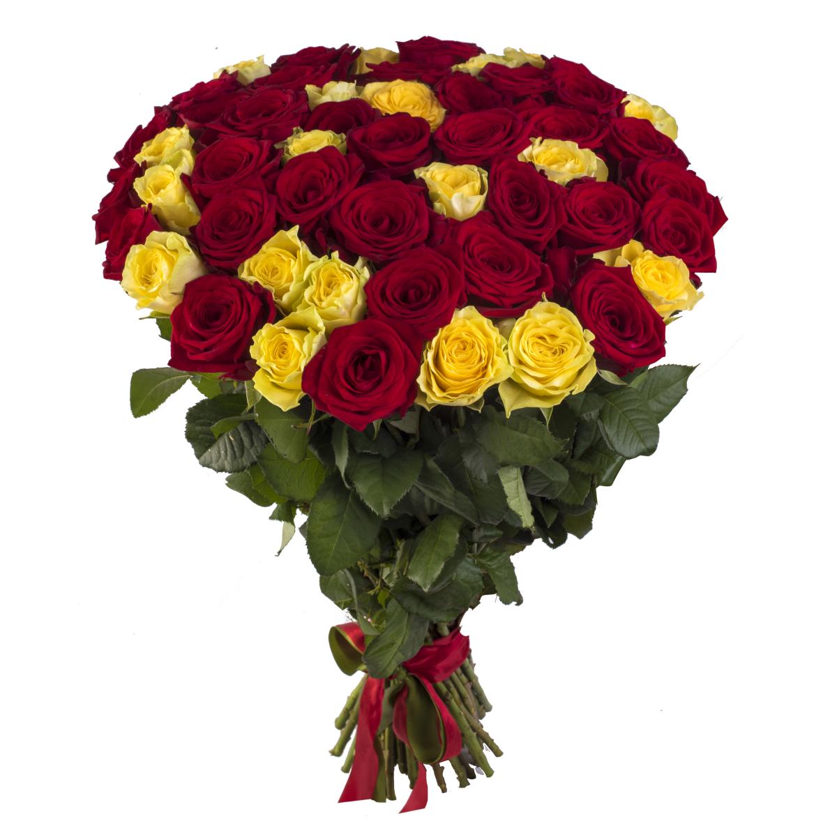 Букет состоит из 23 бордовые розы, 22 желтые розы, прозрачная упаковка, атласная лента.