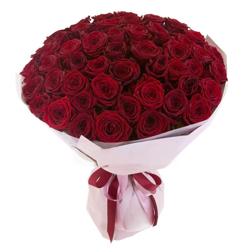 Букет состоит из 51 бордовая роза, розовый крафт, атласная лента.
