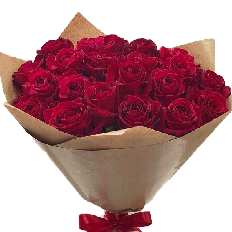 Букет состоит из 21 бордовая роза, крафт, атласная лента.