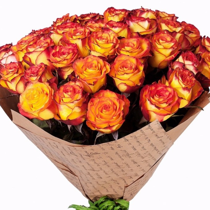 Букет состоит из 31 оранжевая роза, крафт, атласная лента.