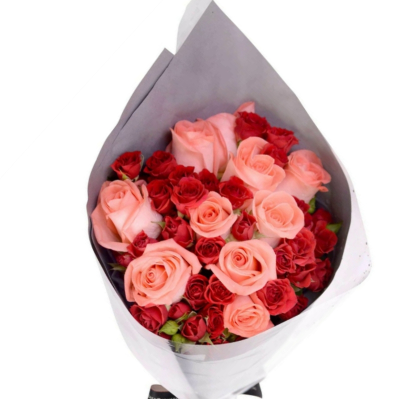 Букет состоит из 11 коралловых роз, 6 веток красных роз, красивая упаковка, атласная лента.