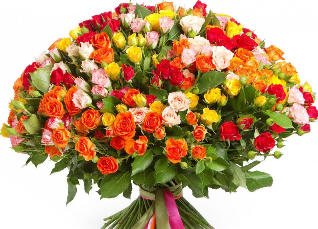 Букет состоит из MIX из 121 кустовой розы, прозрачная упаковка, атласная лента.