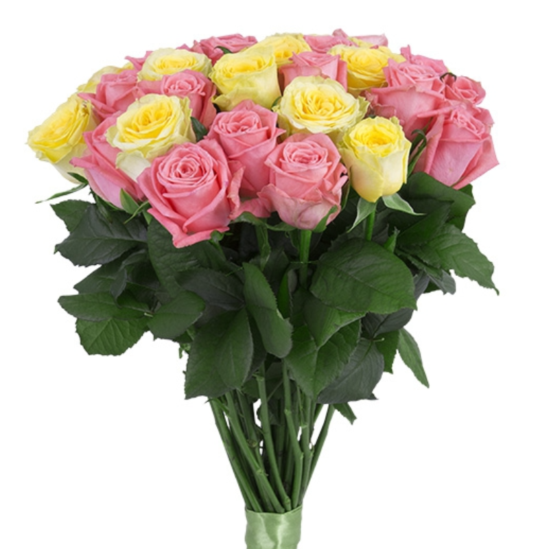 Букет состоит из 11 розовых роз, 10 желтых роз, прозрачная упаковка, атласная лента.