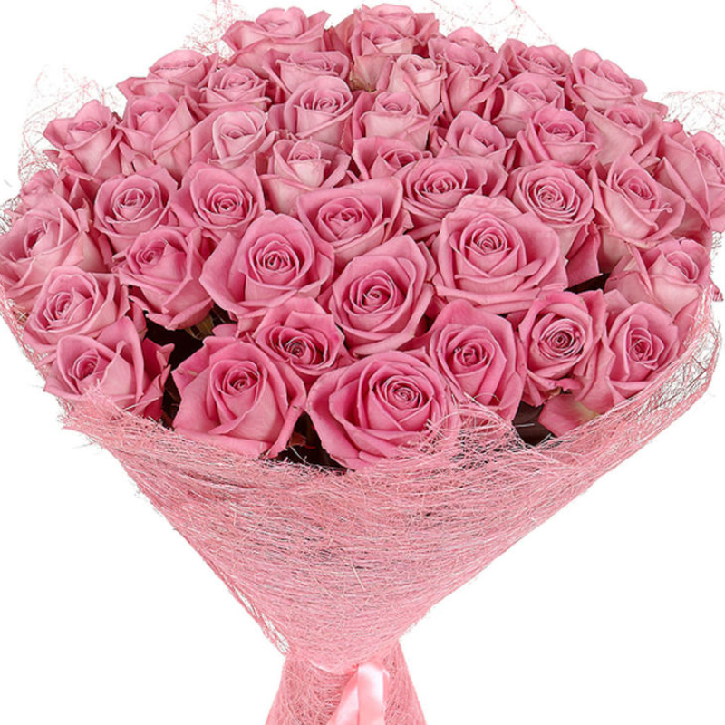 Букет состоит из 35 розовых роз, розовая упаковка, атласная лента.