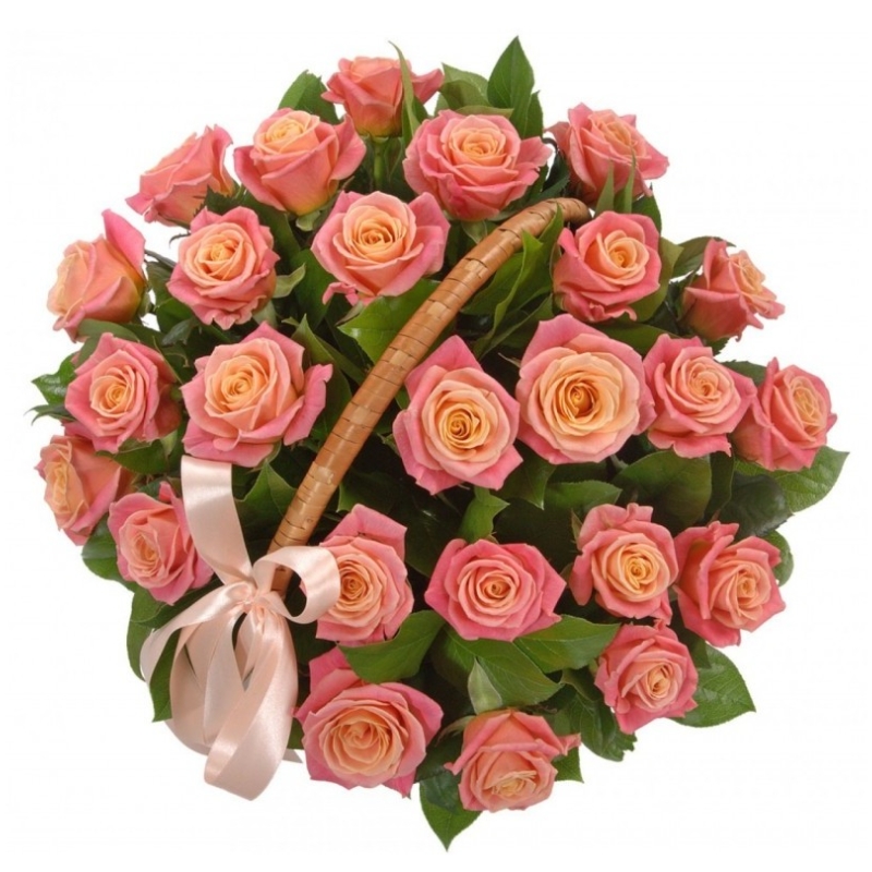 Букет состоит из 25 розовых роз, корзина, розовая лента.