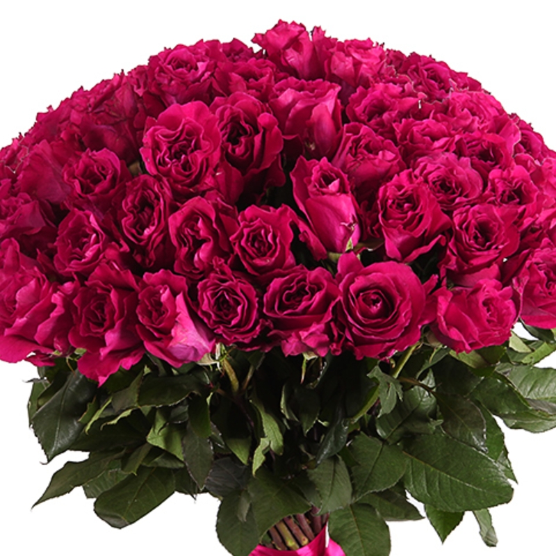 Букет состоит из 55 малиновых роз, прозрачная упаковка, атласная лента.