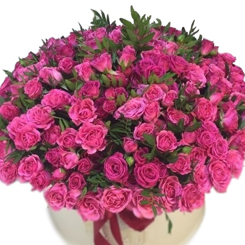 Букет состоит из 35 веток малиновых кустовых роз, зелень, коробка, оазис.